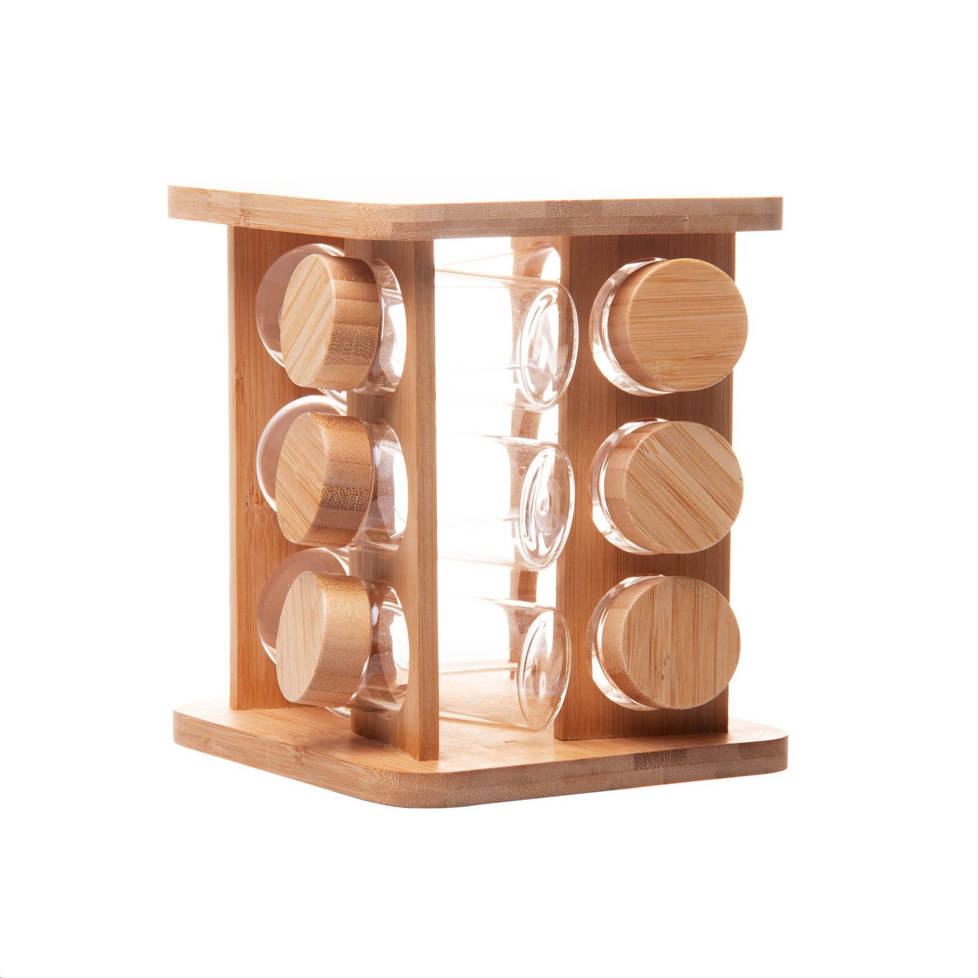 CJ 12 POTES EM BOROSSILICATO COM TAMPA HERMETICA E RACK GIRATORIO EM BAMBU 120ML